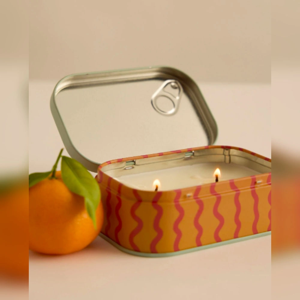 4.5 oz Two-Wick Tin Candles. Inspired by vintage sardine tins, these unique candles feature a faux pull-tab, hand-illustrated artwork, and a soft, flickering glow from two wicks. Their comforting scents make every light feel like a little escape.